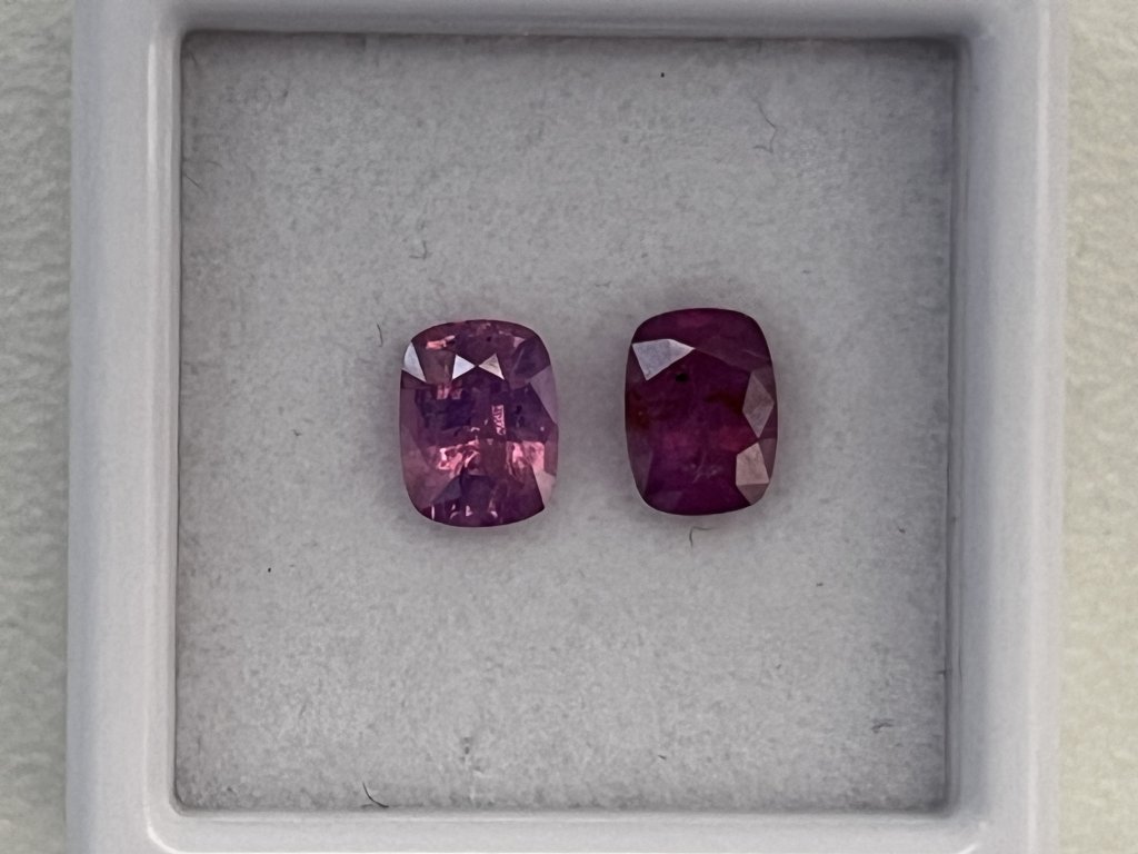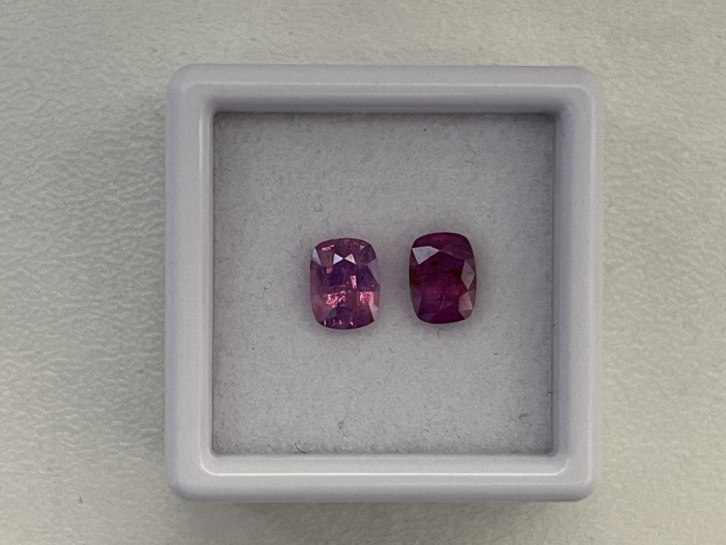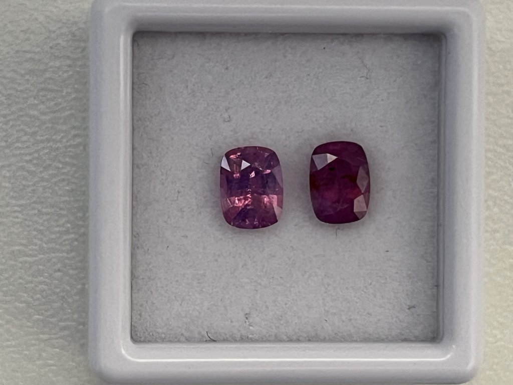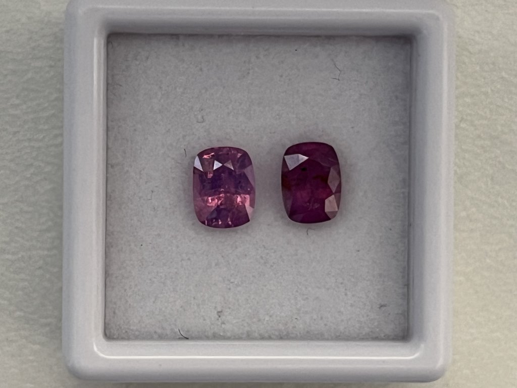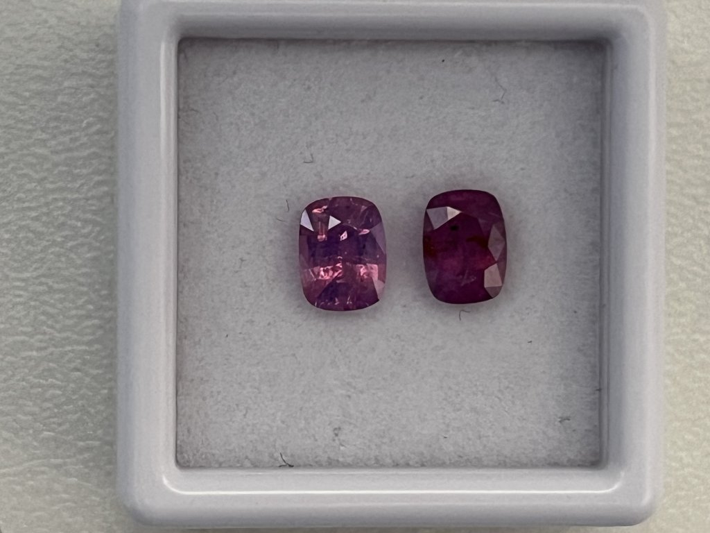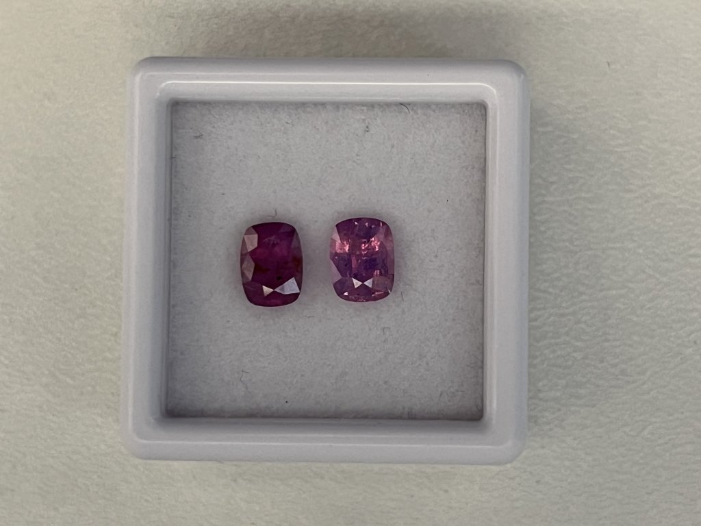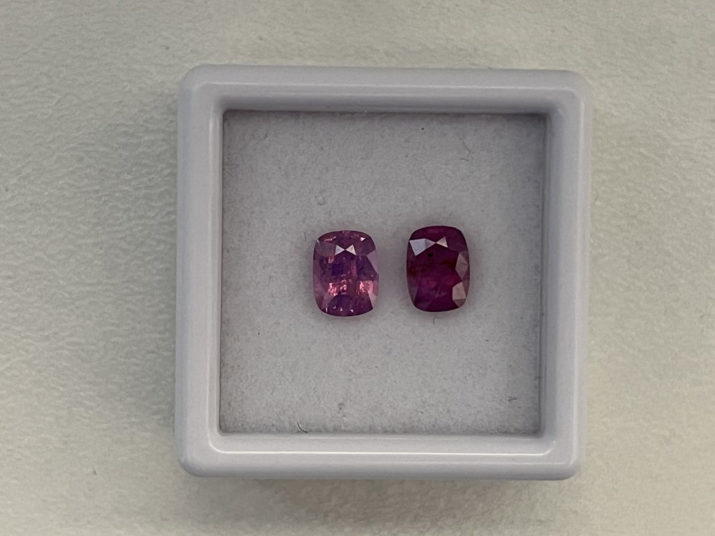 Nabízíme dva fialové safíry cushion ve velikosti cca 6 x 4,5 mm s hmotností od 0,73 do 0,84 ct. Jeden kámen je průhledný, druhý mléčně zabarvený, oba s okem viditelnými nečistotami a nižší kvalitou, vhodné pro příznivce výhodných nákupů. Kameny jsou tepelně upravené a pocházejí ze Srí Lanky. Tvrdost 9 na Mohsově stupnici zaručuje odolnost a dlouhou životnost.