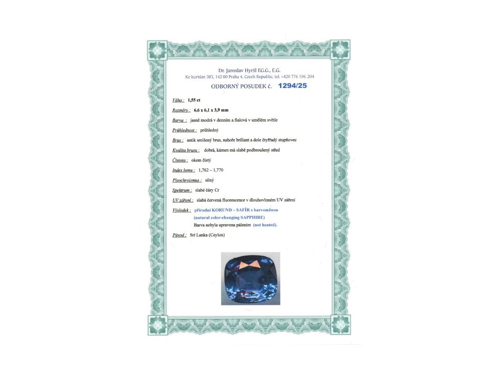 Safír modrý cushion 1,55 ct NATURAL CERTIFIKOVÁN