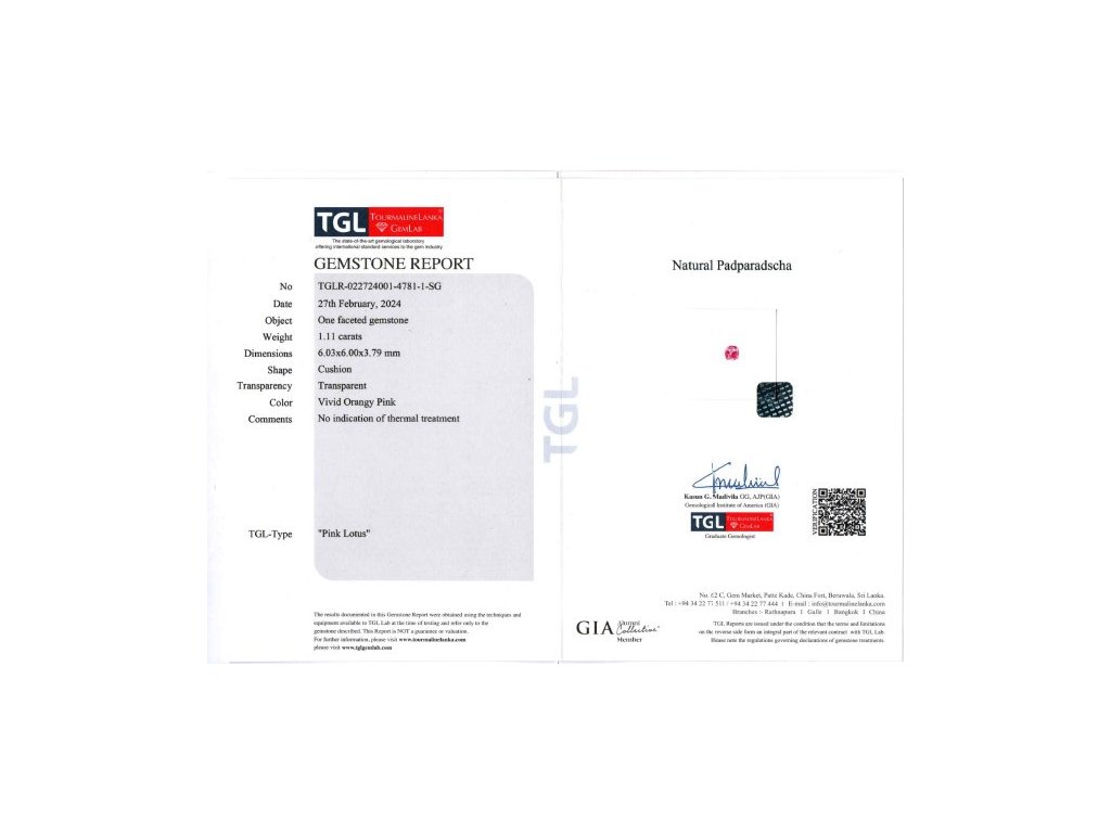 Certifikát: TGL (TourmalineLanka GemLab)
