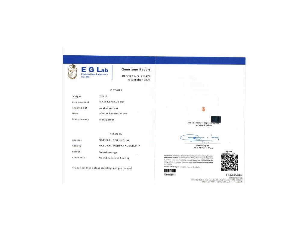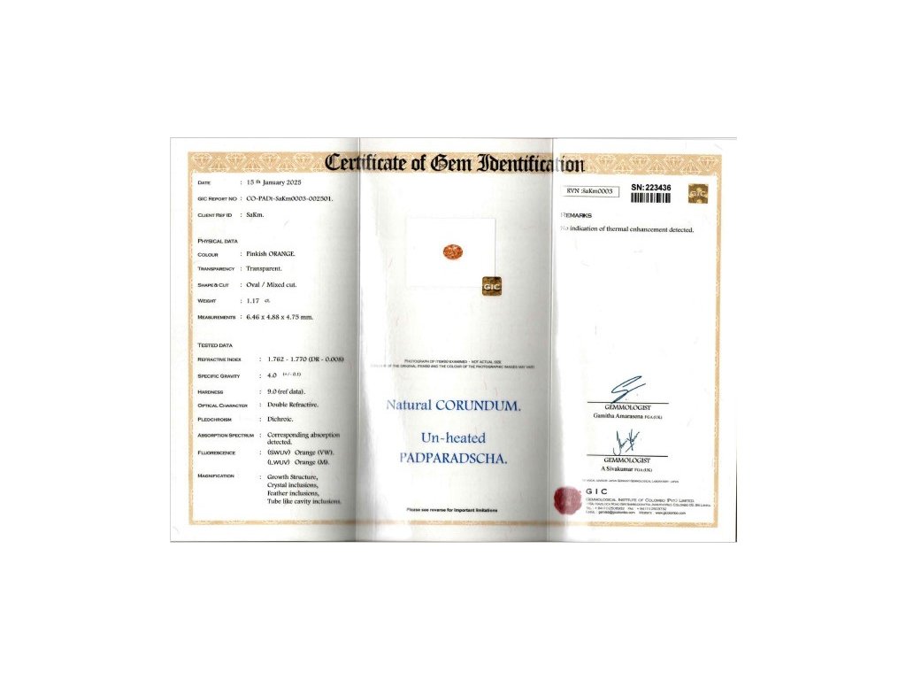 Skutečně exkluzivní Padparadscha safír! Tento přírodní a tepelně NEupravený Padparadscha safír je opravdu vzácným klenotem. Vysoká hodnota tohoto konkrétního safíru je dále dána optimální vyvážeností poměru oranžové a růžové barvy, ale i váhou nad 1 karát. Tento drahokam je certifikován hned dvěmi nezávislými gemologickými laboratořemi, které potvrzují jeho pravost a výjimečnou kvalitu. Velmi výhodná investice nebo drahokam do investičních šperků. Dále jej šlechtí vysoká čistota, precizní brus s velmi hlubokou rundistou, který odráží tisíce odlesků- můžete nahlédnout zde: