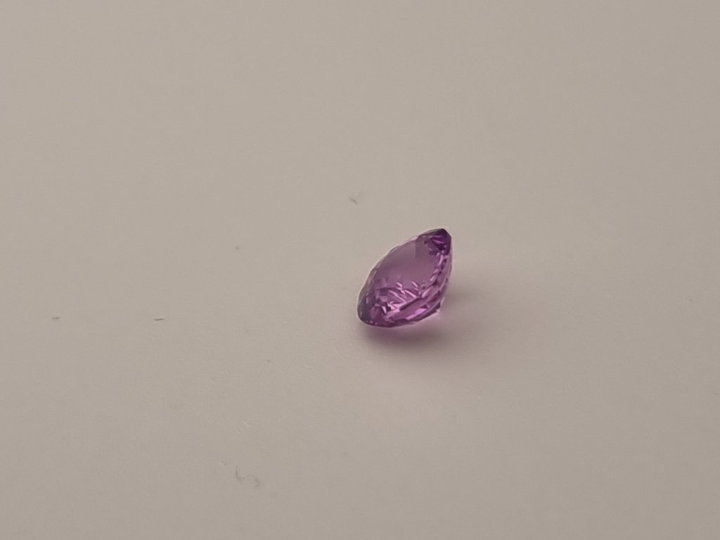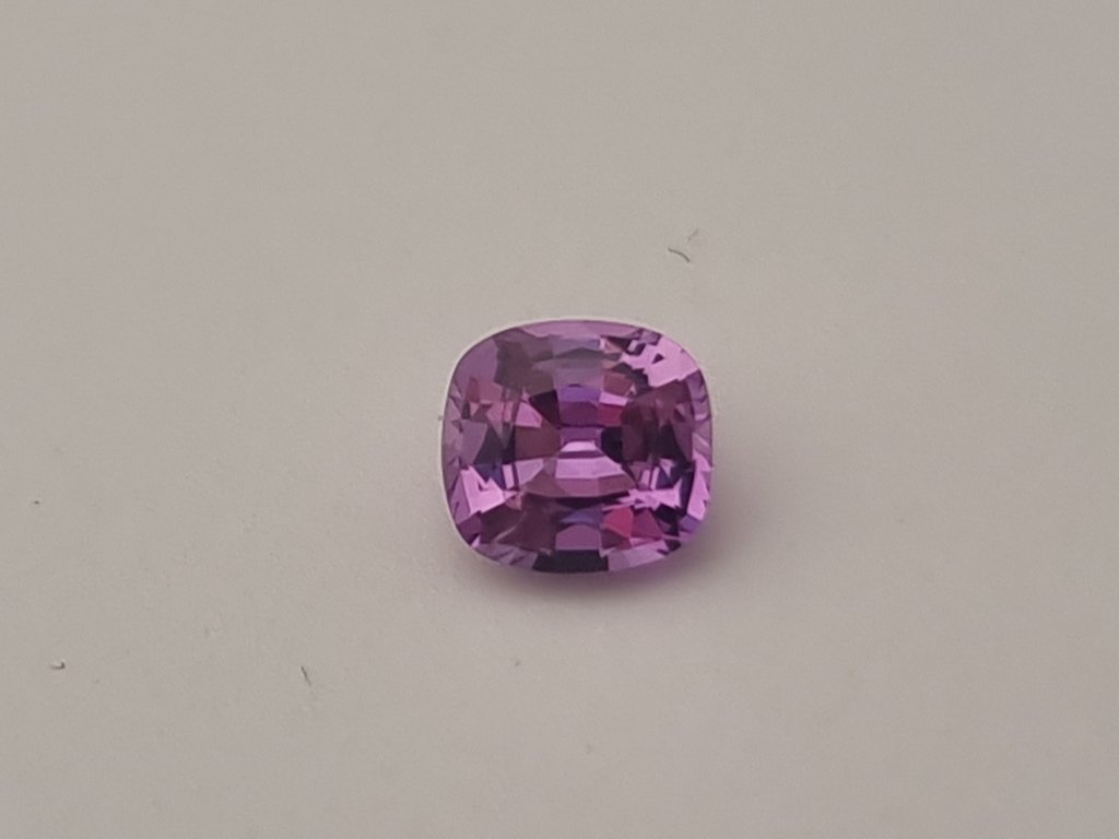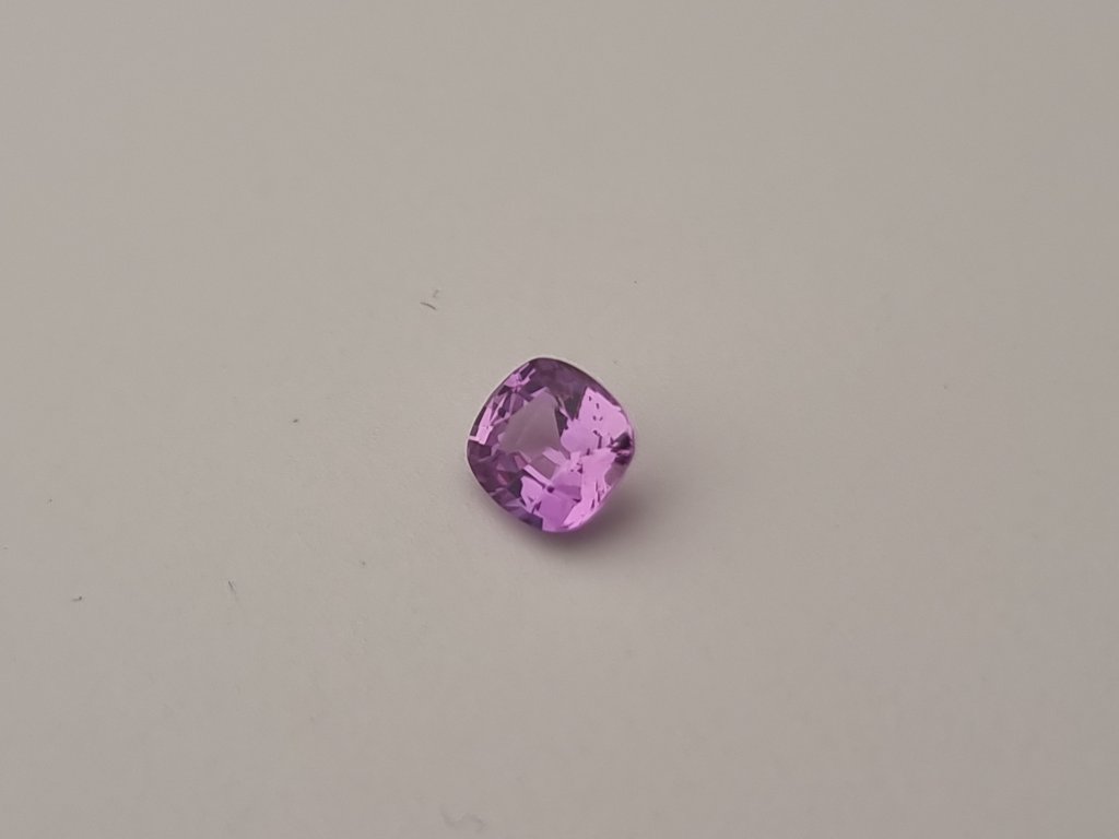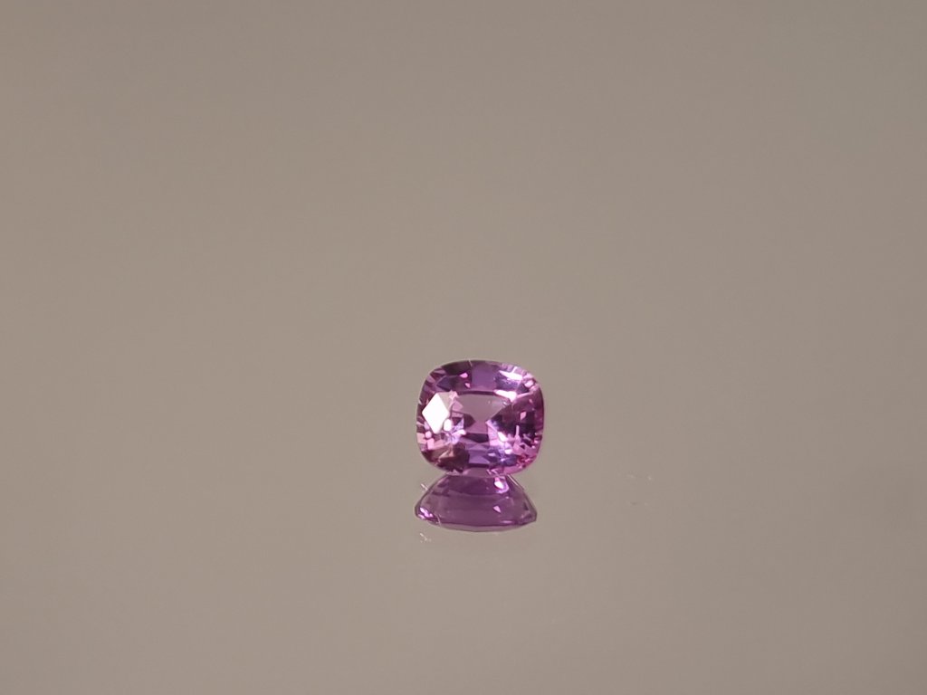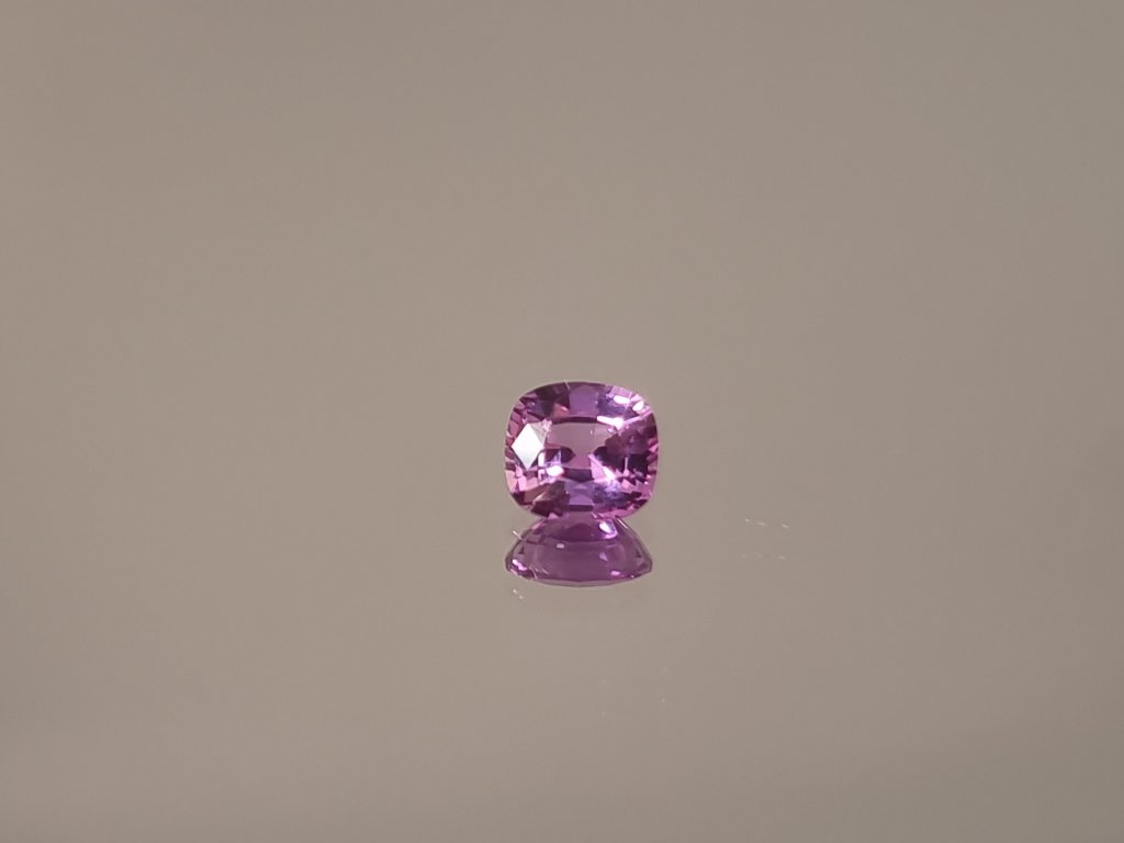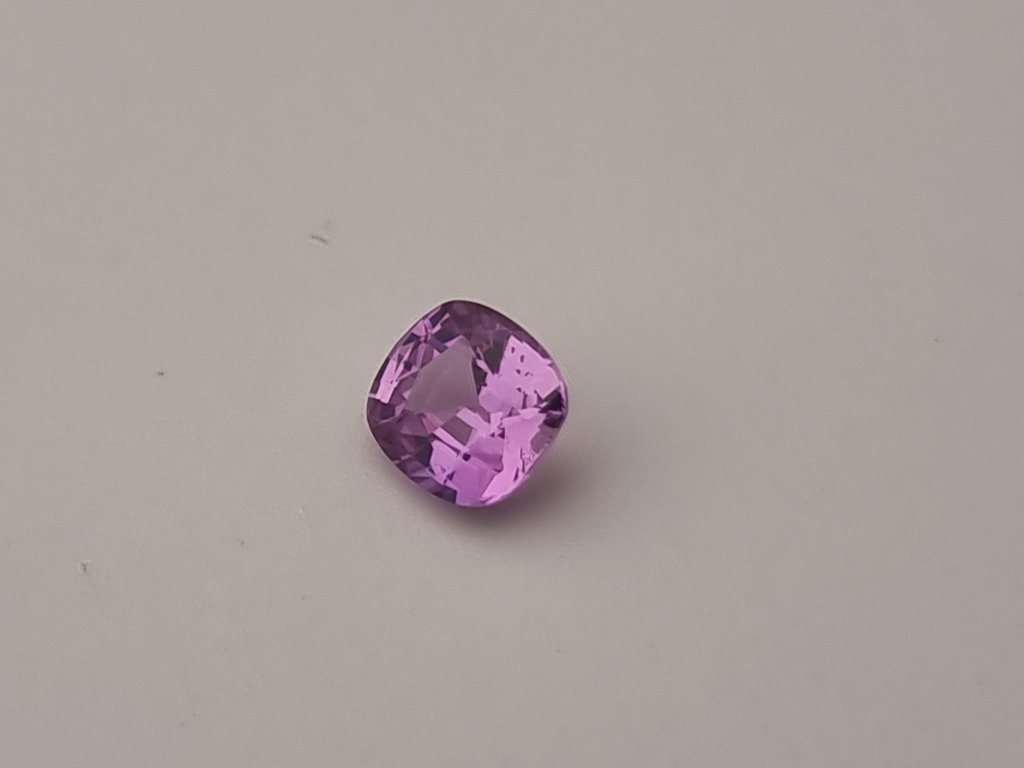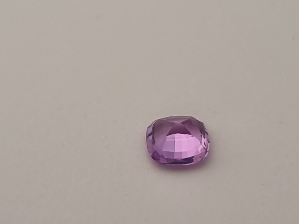 Tento přírodní růžový korund ze Srí Lanky okouzlí svým jemným odstínem růžové s nádechem do fialova, který působí romanticky a zároveň elegantně. Kámen má hmotnost 0,54 ct, rozměry 4,80 × 4,49 mm a je čistý, bez viditelných inkluzí. Precizní cushion brus zvýrazňuje jeho barvu i lesk. Kámen byl tepelně upraven (H/Heated) – běžně akceptovanou metodou, která zvyšuje jeho optickou kvalitu. Díky tvrdosti 9 na Mohsově stupnici je ideální volbou pro každodenní i výjimečné šperky.