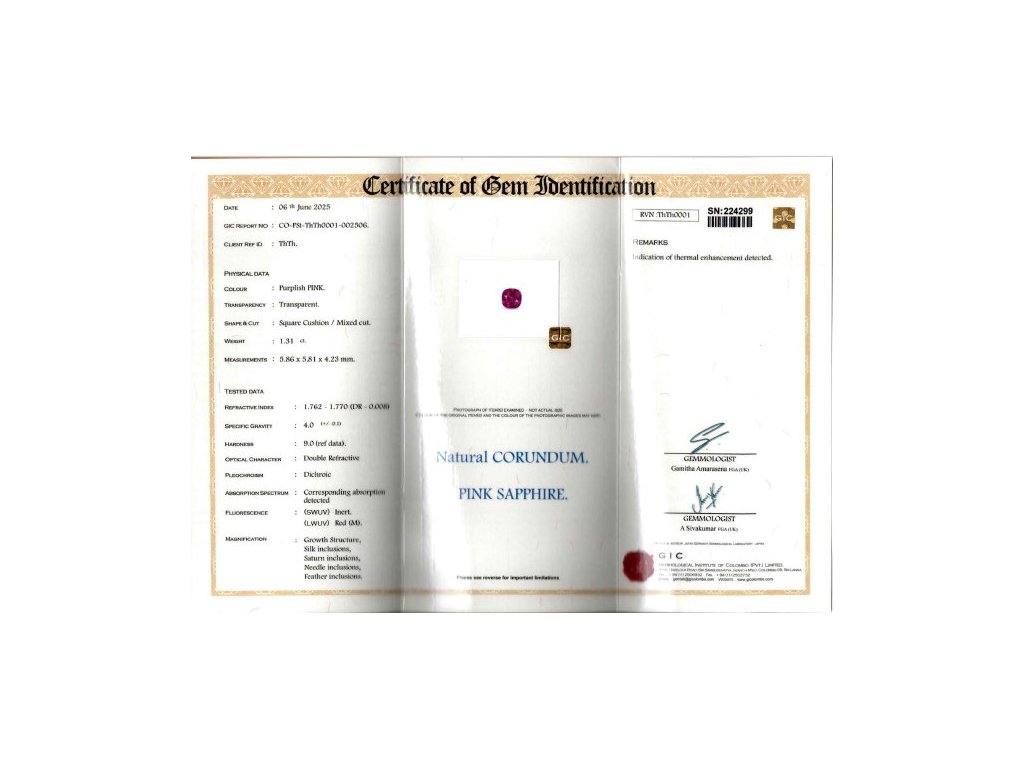 Tento přírodní růžový safír ze Srí Lanky v elegantním cushion brusu zaujme sytým odstínem růžové. S hmotností 1,31 ct a precizním výbrusem nabízí skvělou brilanci a rovnováhu mezi jemností a luxusem.