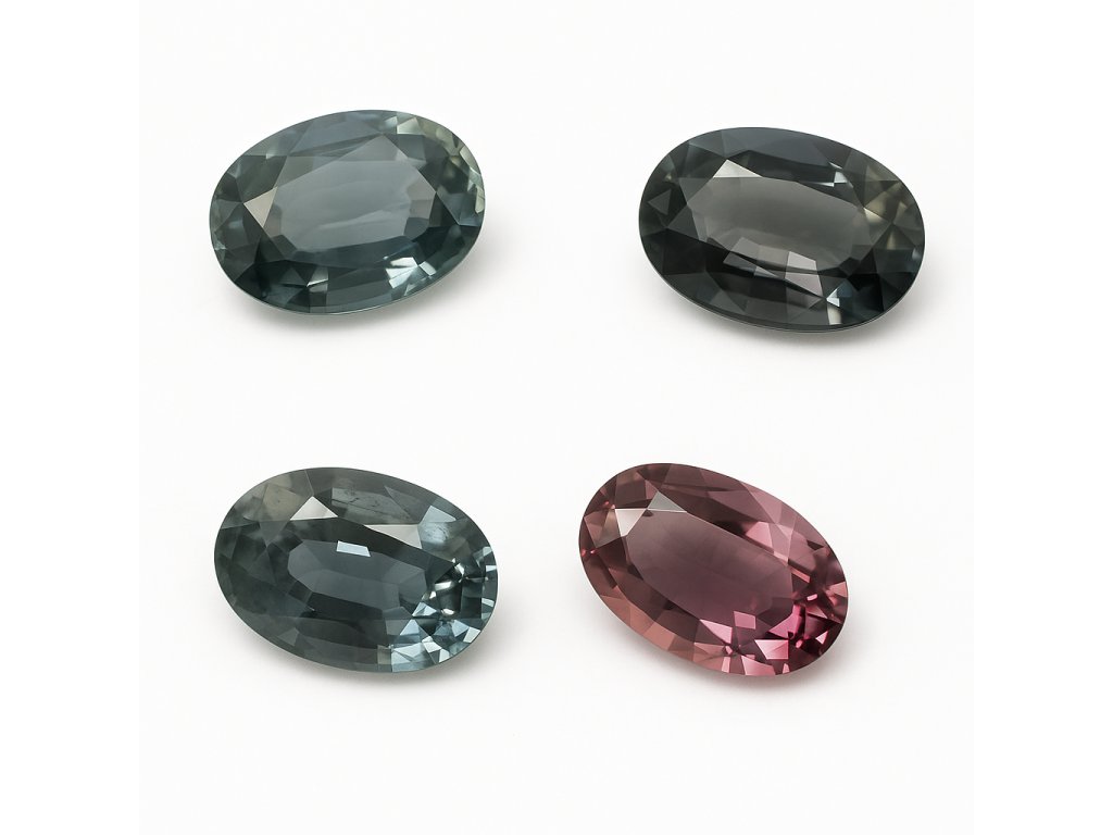 Kolekce přírodních spinelů ze Srí Lanky nabízí širokou škálu odstínů od narůžovělé, fialové a šedé až po zelenou či jemně modrou. Každý kámen má elegantní oválný brus o velikosti 6 × 4 mm, vynikající čistotu a přirozený lesk.
